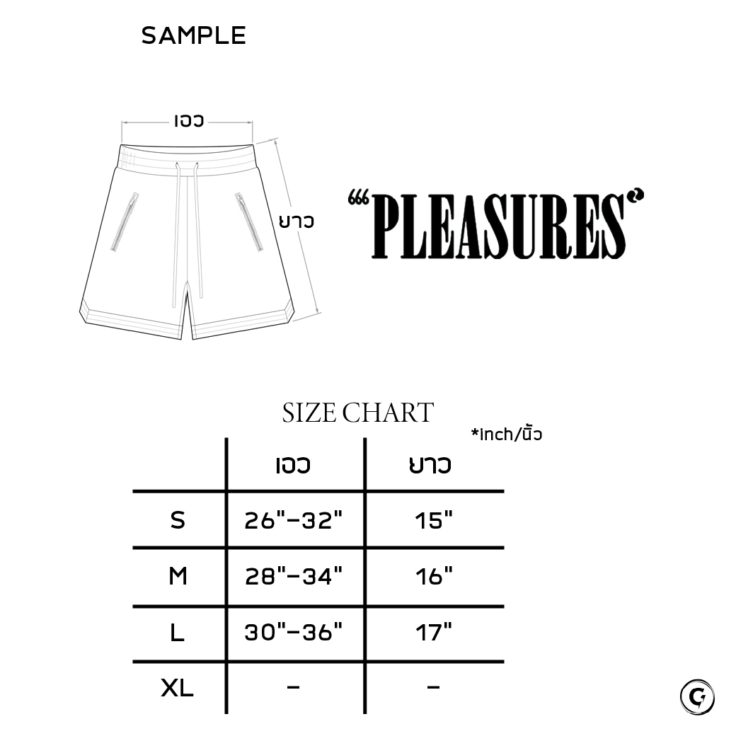- ขากางเกงด้านหน้าสกรีนคำว่า PLEASURES เป็นแนวตั้งสีดำ